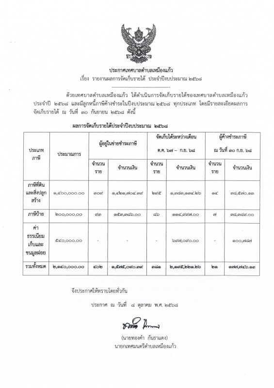 ประชาสัมพันธ์เทศบาลตำบลเหมืองแก้ว เรื่อง รายงานผลการจัดเก็บรายได้ ประจำปีงบประมาณ ๒๕๖๘