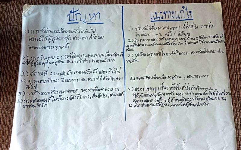 โดยวิทยากรได้นำผู้นำหมู่บ้านและตัวแทนหมู่บ้านของผู้สูงอายุในชุมชนทั้ง 9 หมู่บ้าน ทำกิจกรรมถอดบทเรียนโรงเรียนผู้สูงอายุ ซึ่งได้มีการแลกเปลี่ยนเรียนรู้เรื่องต่าง ๆ เช่น แนวทางการบริหารจัดการโรงเรียนผู้สูงอายุในอนาคต , ปัญหาที่เกิดขึ้นและแนวทางการแก้ไขปัญหา , ข้อเสนอแนะต่อการจัดกิจกรรมครั้งต่อไป เป็นต้น