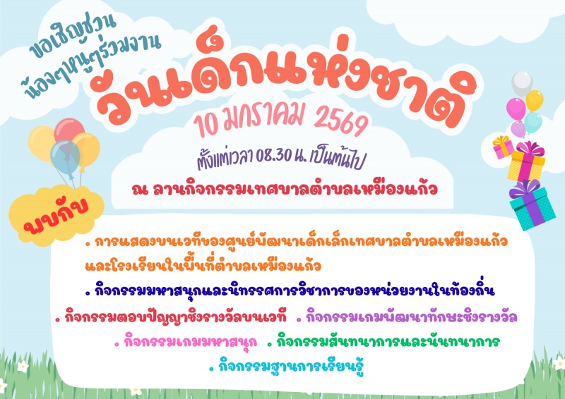 ขอประชาสัมพันธ์เชิญชวนน้องๆหนูๆเข้าร่วมงานวันเด็กแห่งชาติ ประจำปี 2569