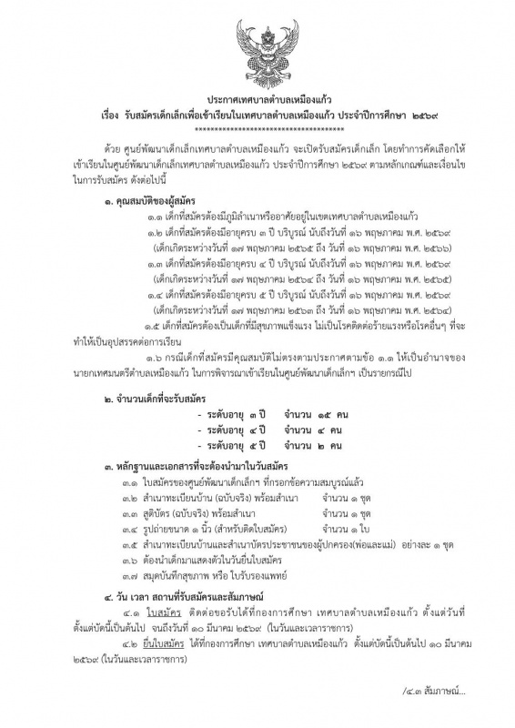 ประกาศเทศบาลตำบลเหมืองแก้ว เรื่อง รับสมัครเด็กเล็กเพื่อเข้าเรียนในเทศบาลตำบลเหมืองแก้ว ประจำปีการศึกษา 2569