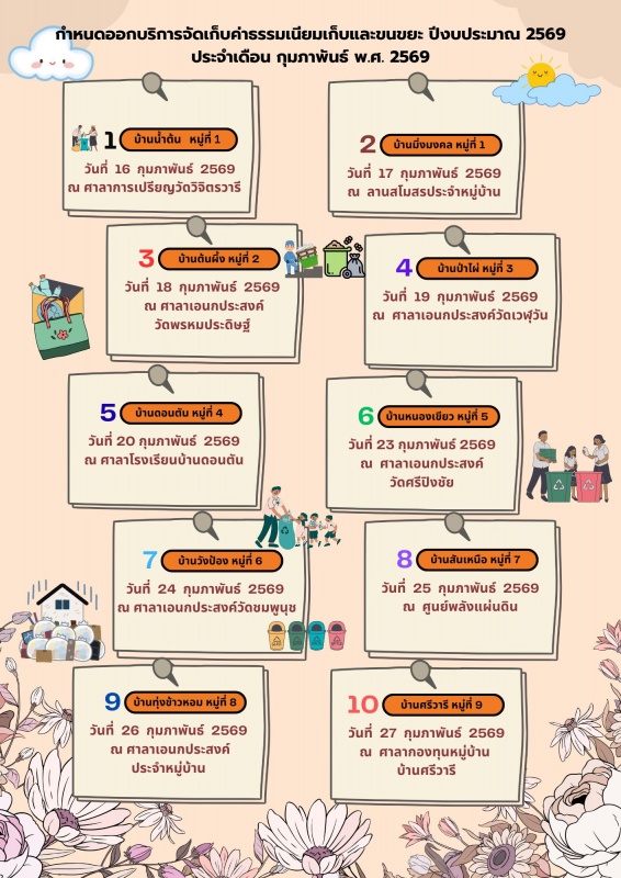 ตารางกำหนดออกบริการจัดเก็บค่าธรรมเนียมเก็บและขนขยะ ปีงบประมาณ 2569