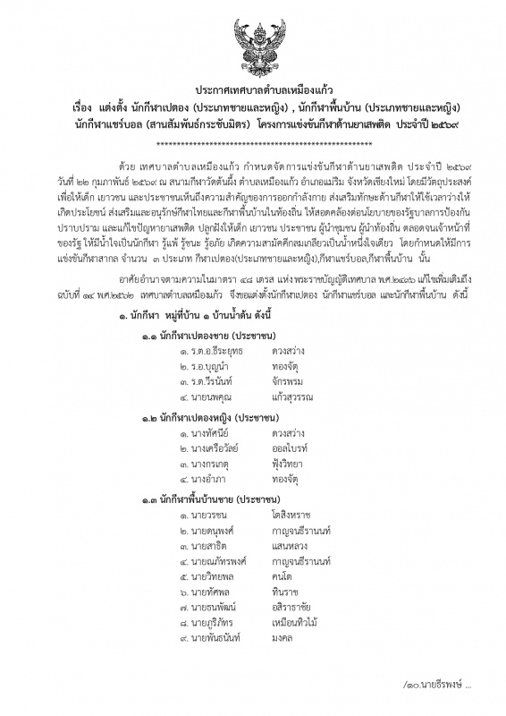 ประกาศเทศบาลตำบลเหมืองแก้ว เรื่อง แต่งตั้ง นักกีฬาเปตอง (ประเภทชายและหญิง) ,นักกีฬาพื้นบ้าน (ประเภทชายและหญิง) ,นักกีฬาแชร์บอล (สานสัมพันธ์กระชับมิตร) โครงการแข่งขันกีฬาต้านยาเสพติด ประจำปี 2569
